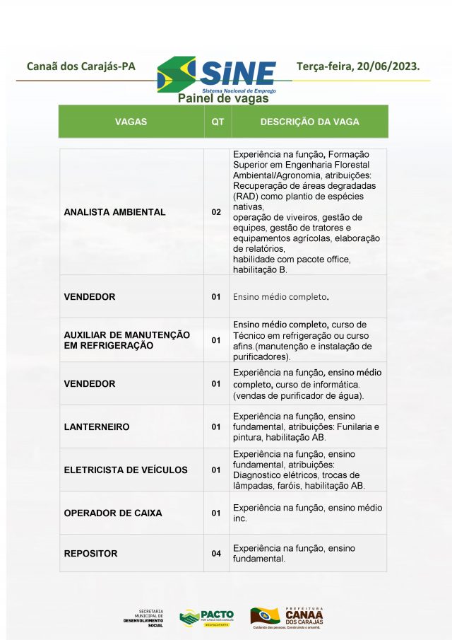 O Sine de Canaã dos Carajás divulgou as vagas em aberto nesta quinta-feira (1). Os interessados devem apresentar currículo, RG, CPF, Carteira de Trabalho e comprovante de residência. Para mais informações, ligue (94) 99123-5373.